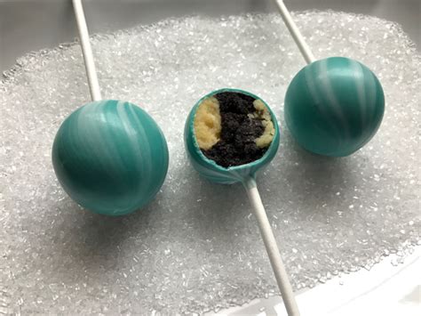 THIS IS A SPONSORED POST. JENNY COOKIES HAS RECEIVED PAYMENT, TRADE AND/OR PRODUCTS IN EXCHANGE FOR PROMOTING, HOWEVER ALL OPINIONS STATED ARE MY OWN AND I ONLY PROMOTE PRODUCTS/COMPANIES I LOVE. Marbling the dough is actually the simplest part. You can use two different kinds of cake (like chocolate and vanilla). Or start with a single light-colored batter, divide it, and tint one (or both) parts a different color before baking. The dipping part gets a bit more technical. You’ll need candy coating in two or more colors: a darker hue (I refer to it as the base color) and a lighter one (I call it the accent color). Perfectly pliable cake-pop dough is key to shaping cake pops. Use the cookie scoop to form uniform portions of dough. Scoop the chocolate dough, filling half the scoop, then scoop the vanilla dough, filling the rest. Use the palm of your hand to level the scoop and push off excess dough. Another method to try: scoop a full scoop of each dough, cut the scoop in half and combine the halves. If you must have equal portions of each dough, this method is for you! Roll each portion of dough into a ball. Place on a waxed paper–lined cookie sheet and refrigerate for 15 minutes or longer. Melt the candy coatings while the cake balls are in the fridge. Place each color in a microwave-safe plastic bowl or cup (plastic and silicone are preferred). Microwave for 1 minute at 50 percent power. Stir, though it will still be solid. Continue to heat in 30-second bursts at 50 percent power, stirring between each interval, until the coatings are melted and smooth. Add paramount crystals, EZ-Thin or virgin coconut oil (solid) to thin the candy coatings. Different colors melt to different consistencies, so be sure to thin each coating to a similar consistency — like wet paint. Let the melted candy coatings sit at room temperature for a few minutes. They can always be reheated for 15 to 20 seconds at 50-percent power if they harden. Remove cake balls from the fridge and let them sit at room temperature for a few minutes to take the chill off. Dip about ⅓” of a lollipop stick into one of the candy coatings, then insert into a cake ball about halfway. Do this for all the pieces. Place the lighter (accent color) coating into a zip-top bag. Snip the tip and pipe some lines vertically and horizontally over the bowl of base color. Make sure the lines aren’t too close to one another; you want the darker color peeking through. For a swirl pattern, dip the cake pop into the coating, then twist with your fingers as you lift it out. Carefully shake off excess coating while the pop is still upside down, then turn right side up. Use a toothpick to pierce any air bubbles. For a more random pattern, dip the cake pop, then shake off excess while turning the pop this way and that. Place on a cake-pop stand and let dry completely.So after baking up the six layers of my galaxy rainbow cake (and seeing how short they were) I was unaccountably struck with the fear that there might not be enough cake for all of the guests. (Spoiler: there was tons of cake left over) I decided to make some extra treats for the party, just in case– cake pops. I hadn’t made them in a while, but a little internet research turned up some new techniques for making them look fantastic, so I thought I’d give them a shot, using an extra box of cake mix and some leftover buttercream, plus candy melts. In the past I’ve crumbled up my cake and mixed it with cream cheese or frosting by hand, just because it was easier. However, the results have been somewhat lumpy, probably because the crumbs weren’t quite fine enough and the mixing was uneven. I think I’ve been trying to avoid making the mixture too gooey from overmixing, but it really wasn’t a problem. Solution: use the stand mixer to completely mix the cake and frosting into a smooth, homogenous dough. Add frosting sparingly to avoid your mixture being too soft. Once you’ve got the dough set, portion it into balls and hand-roll them to a generally round shape. If you want them to be even more perfectly round, you can do this: I’ve always had trouble with my candy melts– I use the Wilton ones because they’re all I can get around here— because they never seemed to melt down thin enough. They were always too thick, even after adding tons of shortening or paramount crystals, to make a nice smooth coating on my cake pops. But now I’veMarbled Cake Pops